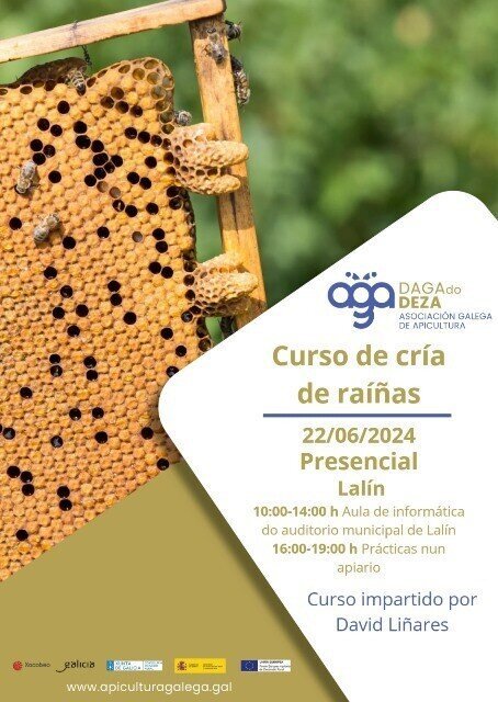 Curso sobre la cría de abejas reina en Lalín, organizado por la Asociación Galega de Apicultura (AGA).Fecha y Detalles: 22 de junio. Curso de cría de abejas reina. Horario: 10:00 a 14:00 horas (Aula de informática del Auditorio de Lalín). Práctica: 16:00 a 19:00 horas (en apiario). Instructor: apicultor David Liñares (De Liñares Apicultura).